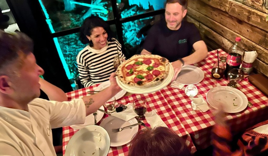 La pizzería Antonio Pizza Napoletana, lleva su nombre en honor a sus dos abuelos provenientes de Italia, uno de ellos escapado de la guerra a los 9 años. Unas siete mesas pequeñas con manteles a cuadrille rojos y blancos coronan y le dan color al pequeño espacio de techo bajo. Un corte rústico en sus paredes, pisos de ladrillos y modestos mobiliarios, intentan replicar un pedacito de la ciudad de Napoles, que vio nacer este plato y cuenta con la primera pizzería del mundo fundada en 1738.