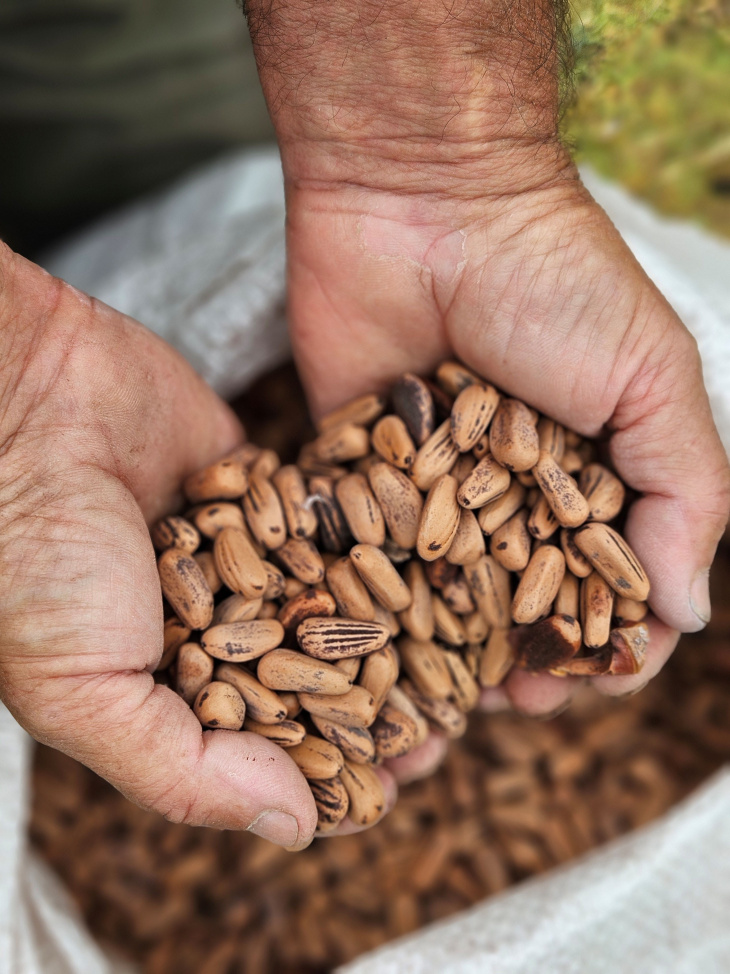 La producción es tan artesanal como desafiante. Entre mayo y octubre, las piñas se cosechan a mano, trepando árbol por árbol con una vara con gancho en la punta para hacerlas caer. Luego se acopian y, durante el verano, se secan naturalmente al sol hasta que se abren. Una máquina separa la semilla y finalmente se obtiene el piñón.